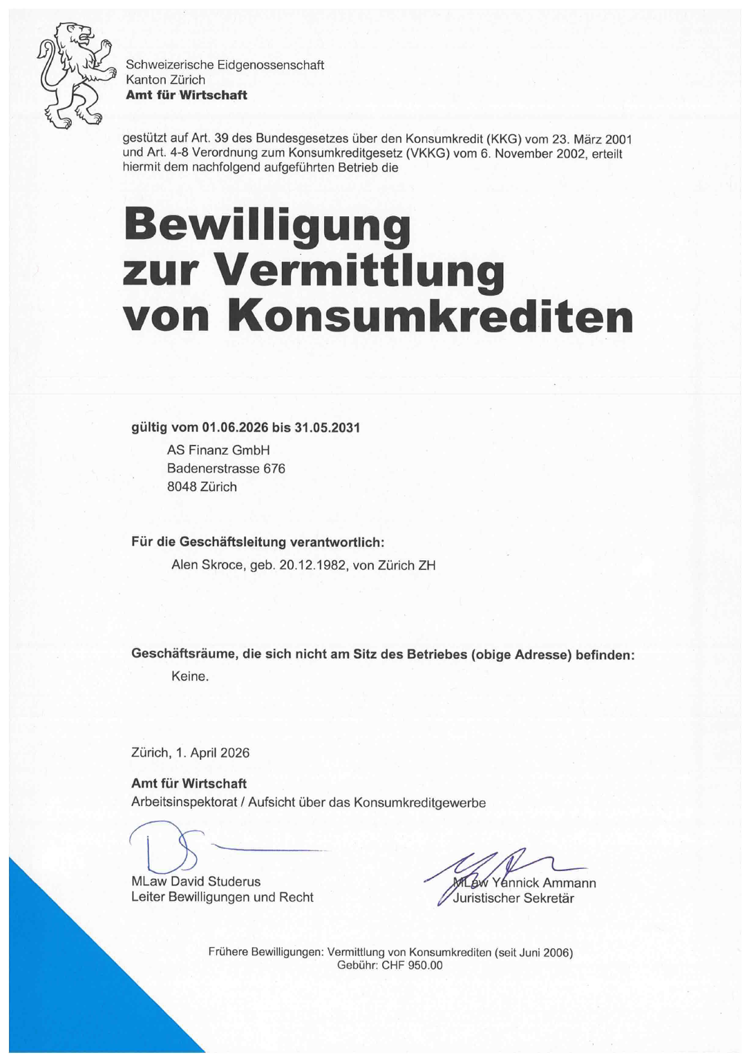 AS Finanz GmbH é uma corretora suíça testada e certificada, com licença do cantão (distrito) para intermediação de crédito.